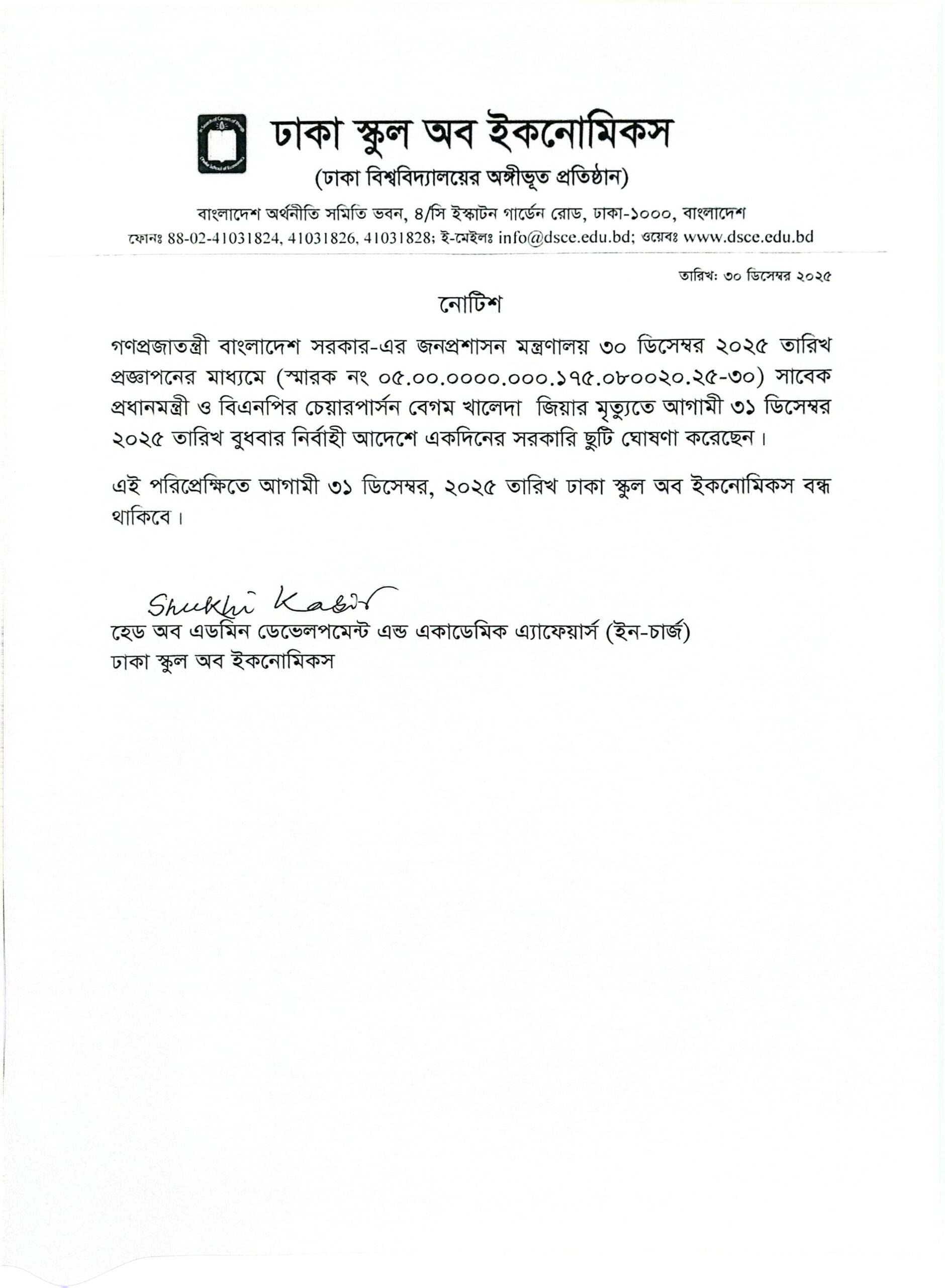 Dhaka School of Economics will remain closed on Wednesday 31.12.2025, a general holiday announced by the Govt. By IT Office | December 30, 2025 | NOTICE |